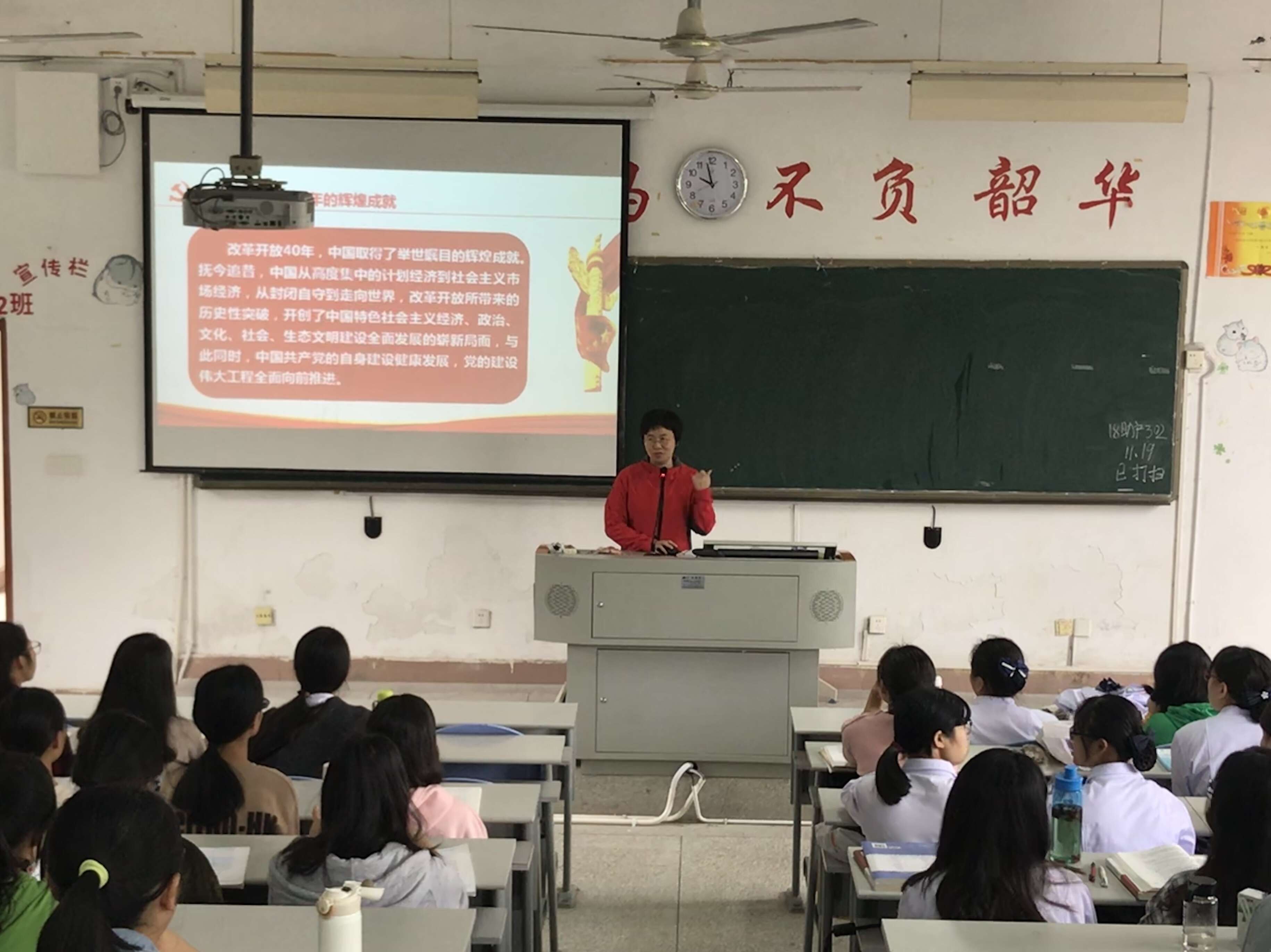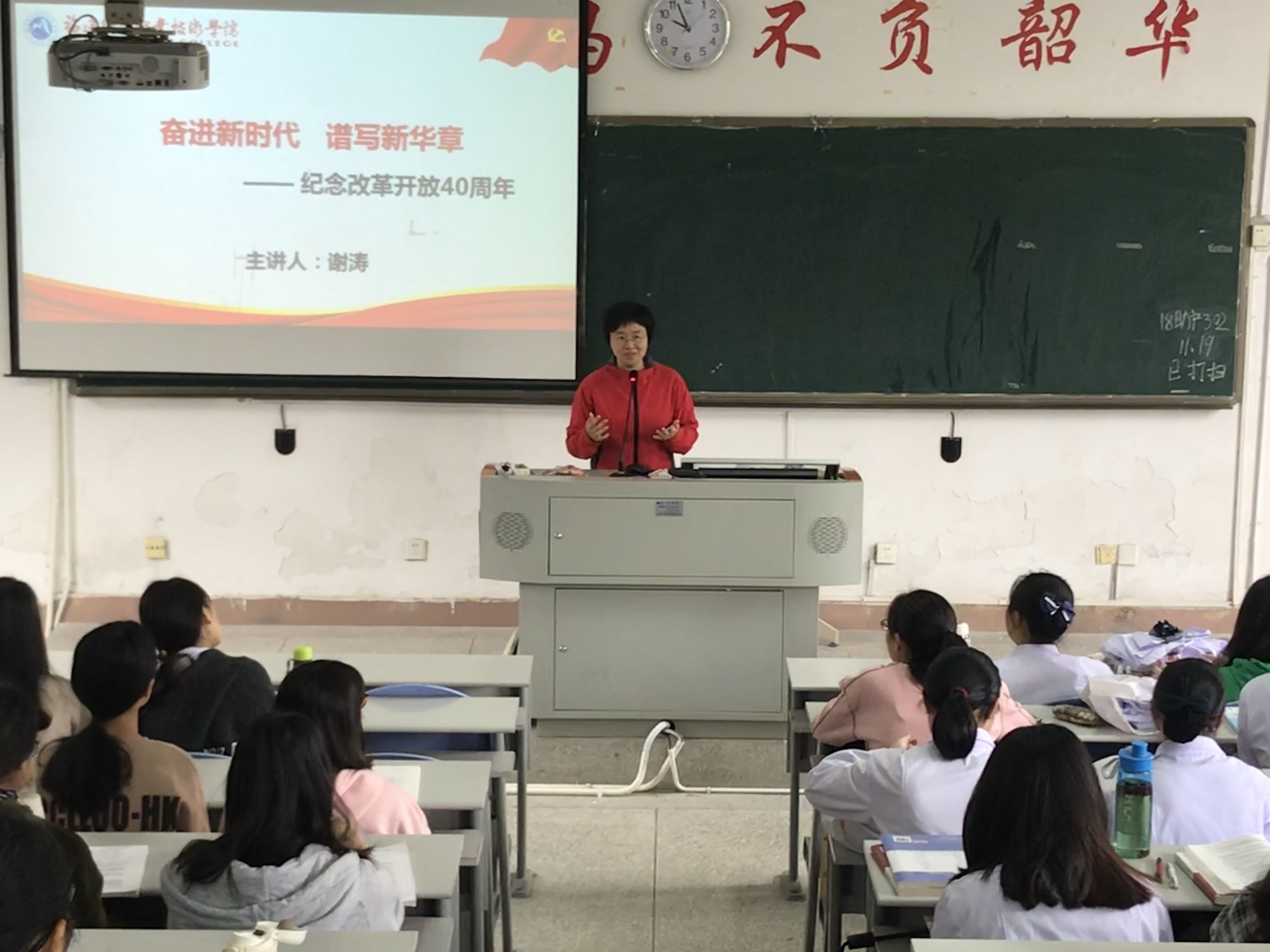 充分發(fā)揮領(lǐng)導(dǎo)干部在思想政治教育工作中的示范引領(lǐng)作用,全面貫徹落實(shí)黨的教育方針和立德樹(shù)人的根本任務(wù),2018年11月19日,護(hù)理系謝濤書(shū)記以“奮進(jìn)新時(shí)代譜寫(xiě)新篇章 ------慶祝改革開(kāi)放40周年”為題,為護(hù)理專(zhuān)業(yè)學(xué)生上了一堂精彩的形勢(shì)與政策課。