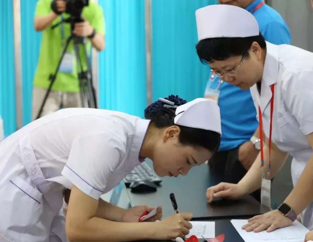 本次大賽由各省、自治區(qū)、直轄市經(jīng)預賽選拔的優(yōu)秀選手組成代表隊,每名選手首先在健康評估室書面完成臨床護理案例分析,然后進入操作室根據(jù)患者病情及醫(yī)囑要求,先后完成右踝扭傷固定包扎、徒手心肺復蘇、靜脈留置針輸液、氣道切開護理四項護理技能操作,主要考核選手護理思維判斷、分析問題、解決問題的能力,檢測選手急救護理技能操作水平及人文職業(yè)素養(yǎng)。