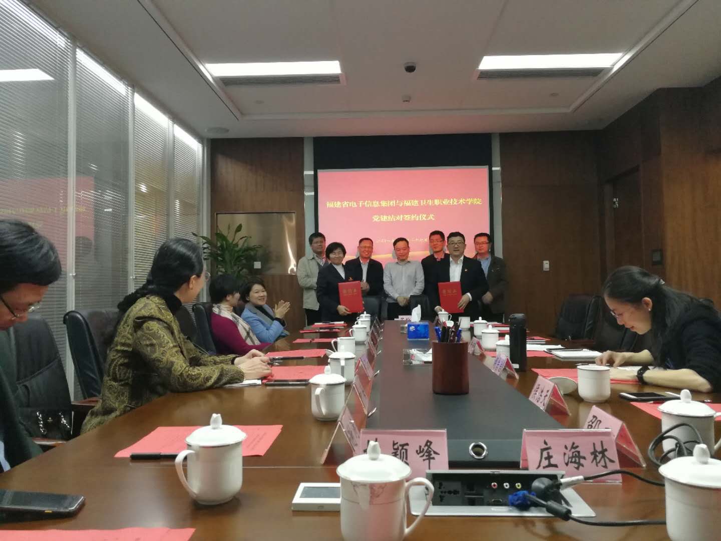 3月27日下午,護(hù)理系黨總支在學(xué)院領(lǐng)導(dǎo)的帶領(lǐng)下,赴福建省電子信息集團(tuán)與其云計(jì)算黨支部開展黨建結(jié)對(duì)及戰(zhàn)略合作協(xié)議簽約儀式。省衛(wèi)健委信息規(guī)劃處劉文明主任、學(xué)院曾武祈書記、集團(tuán)黃舒副總經(jīng)理出席儀式并講話,學(xué)院蘇友新院長(zhǎng)、鄭翠紅副院長(zhǎng),集團(tuán)規(guī)劃部胡巖潔及雙方的相關(guān)領(lǐng)導(dǎo)和部門負(fù)責(zé)人共同見證簽約時(shí)刻。