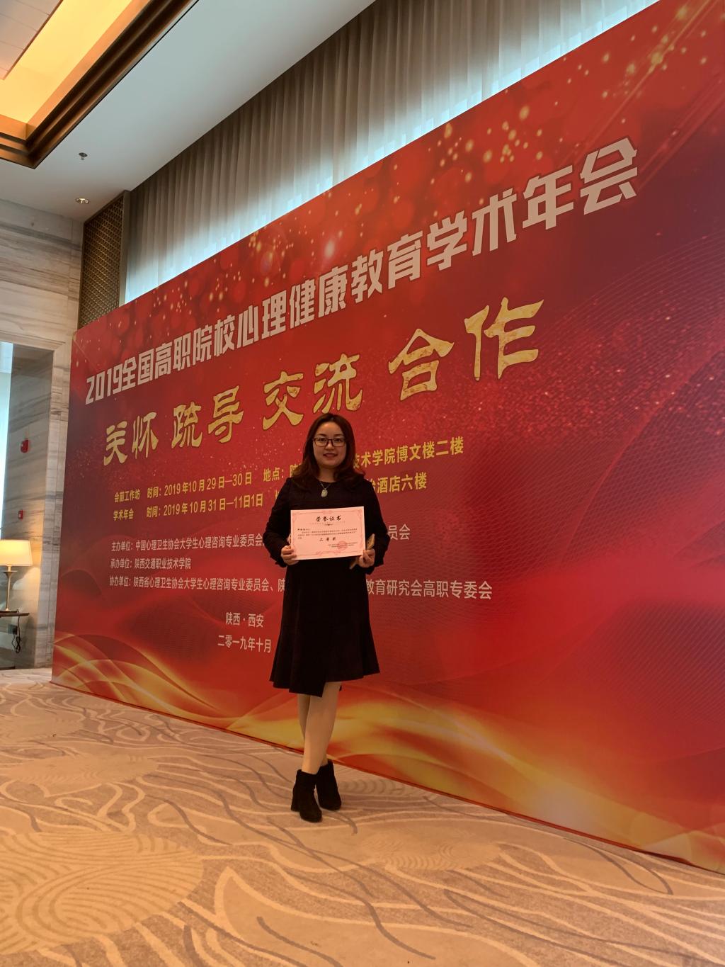 2019年10月31日—11月1日,護理系選派心理輔導站鄭梅欽老師參加了于陜西西安舉行的“2019年全國高職院校心理健康教育學術(shù)年會暨表彰大會”。本次大會以“關懷 疏導 交流 合作”為主題,圍繞高職院校育心與育德工作相結(jié)合的模式、心理育人五位一體工作新格局建設研究、精神衛(wèi)生法框架下的高職院校心理育人的創(chuàng)新性探索、大數(shù)據(jù)技術(shù)合作與高職院校心理育人的信息化管理研究、心理育人工作與學生管理工作聯(lián)動機制實踐研究、高職院校學生心理咨詢與心理危機預防干預案例研究、高職院校學生心理育人工作體制機制和隊伍建設研究等七個議題,開展深入的交流和研討。