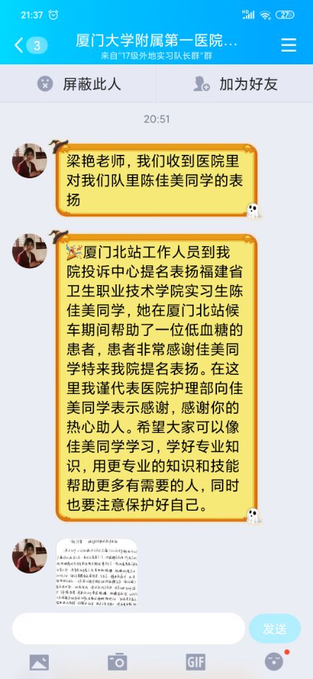 2019年11月26日,我系收到廈門大學附屬第一醫(yī)院護理部給我們發(fā)來的一封表揚信,表揚信中講述了我系2017級護理313班陳佳美同學于2019年11月13號在廈門北站候車時,聽到廣播站在呼叫醫(yī)務人員,她立即找到廣播站,在工作人員帶領下來到一位中年男子面前,當時該男子四肢乏力,言語不清,大量出汗,佳美同學馬上對其進行脈搏測量,隨后詢問該男子是否有糖尿病、高血壓及家族遺傳病史,簡單了解情況后又得知該男子沒有吃晚飯,佳美同學懷疑他可能是低血糖,隨后讓他吃了東西,大概十分鐘后再次給他測了脈搏,還是偏低,她立即聯系動車站工作人員撥打120,并處理好男子車票相關事宜后才離開動車站,隨后該男子經急救車送往醫(yī)院救治,轉危為安。11月24日該男子來到廈門北站,通過客戶中心的工作人員了解到陳佳美同學是福建衛(wèi)生職業(yè)技術學院的學生,目前在廈門大學附屬第一醫(yī)院實習,希望工作人員能夠和醫(yī)院聯系,對陳佳美同學表示感謝。