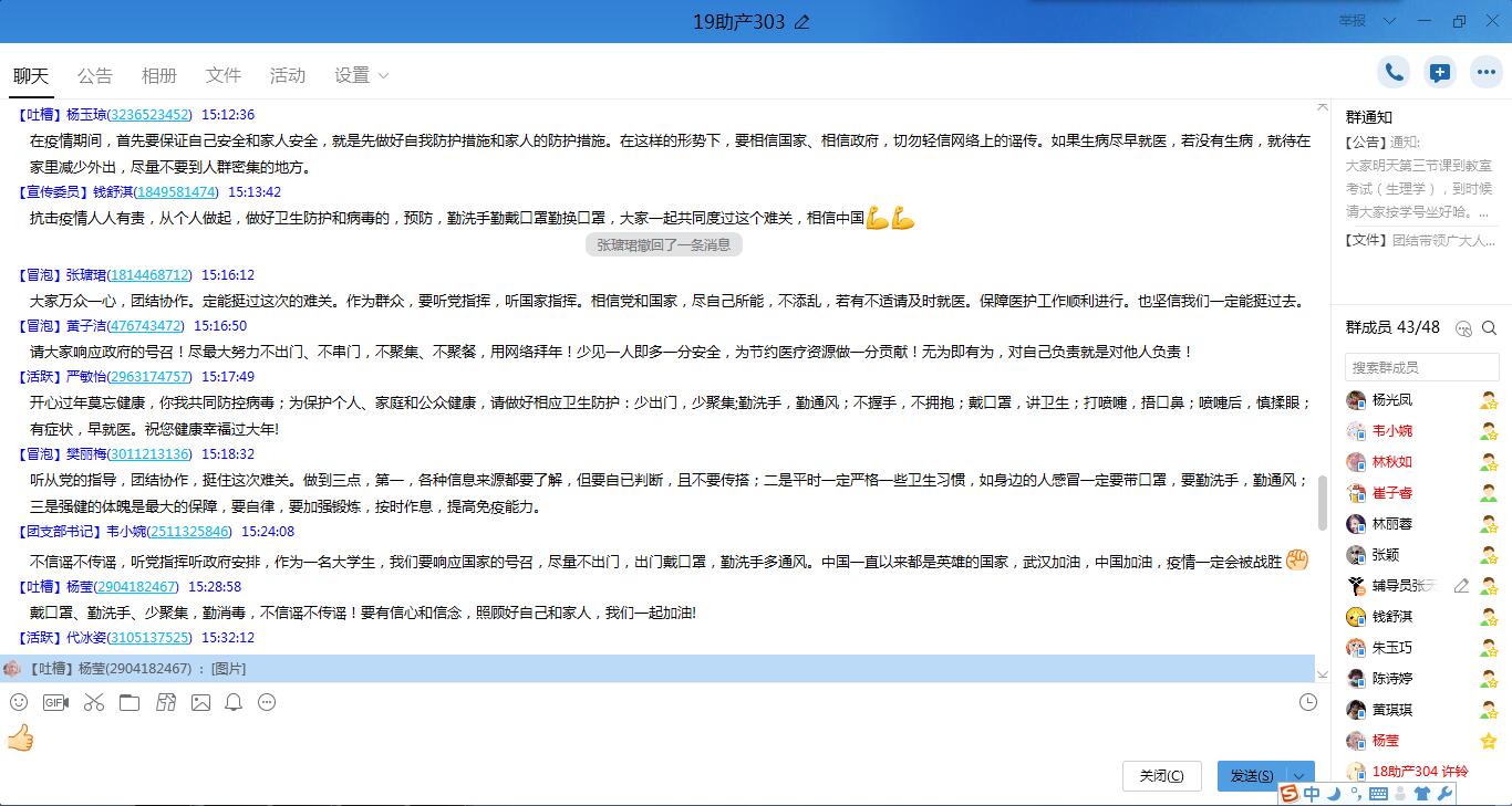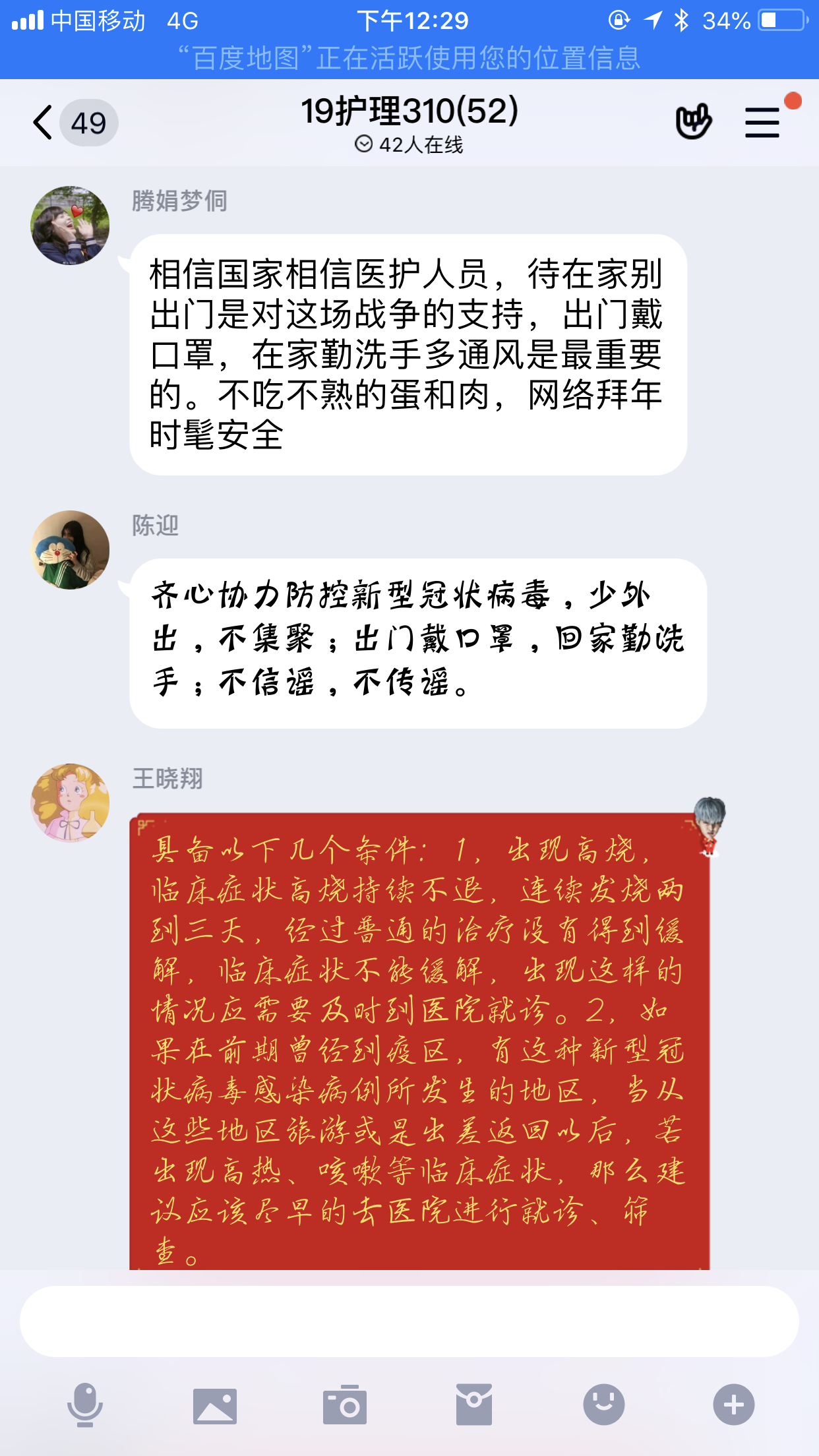 1月29日,護理系各黨支部以學(xué)習(xí)強國視頻會議的形式召開黨員大會,護理系各班級以QQ群視頻會議、YY視頻會議等形式召開主題班會,將習(xí)近平總書記關(guān)于當(dāng)前新型冠狀病毒感染肺炎疫情防控工作重要指示精神以及學(xué)院黨委中心組(擴大)會議精神等傳達到每位師生。