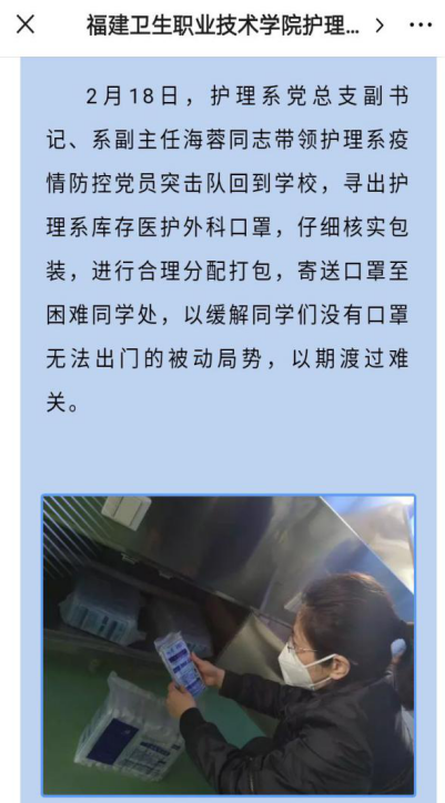 在學(xué)校的統(tǒng)一安排指導(dǎo)下,為確保我校學(xué)生人身安全,護(hù)理系黨總支積極安排各班級(jí)進(jìn)行調(diào)查摸排關(guān)于滯留于實(shí)習(xí)地學(xué)生的困難情況,積極協(xié)調(diào),收集學(xué)生的具體地址,為存在口罩困難的學(xué)生解決口罩困難問(wèn)題,積極為留在實(shí)習(xí)滯留地的實(shí)習(xí)生解決口罩問(wèn)題,并將實(shí)驗(yàn)室留存的口罩用快遞的方式寄到需要的同學(xué)手中。