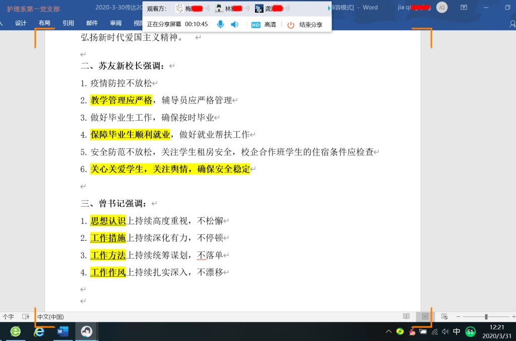 學(xué)院疫情防控領(lǐng)導(dǎo)小組第七次會議暨開學(xué)前工作部署會后,護理系黨總支中心組、各黨支部、各教研室等通過線上線下的形式,認真將會議精神傳達到每位黨員、教職工。