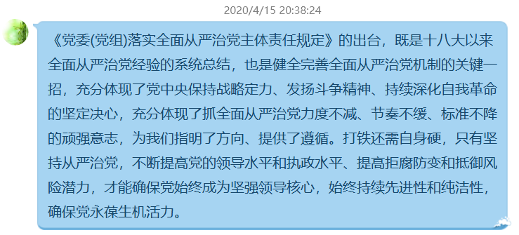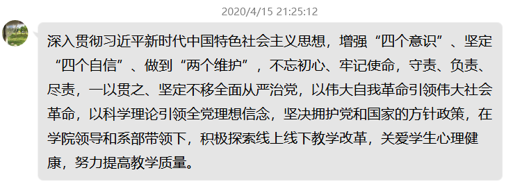 龔海蓉主任表示,學(xué)習(xí)了《黨委(黨組)落實全面從嚴(yán)治黨主體責(zé)任規(guī)定》是一場思想政治的洗禮,要求全系黨員老師嚴(yán)格遵守各項規(guī)定,配合學(xué)院做好防疫工作,并認(rèn)真進(jìn)行線上教學(xué)并做好系部教學(xué)管理工作,保證教學(xué)質(zhì)量。