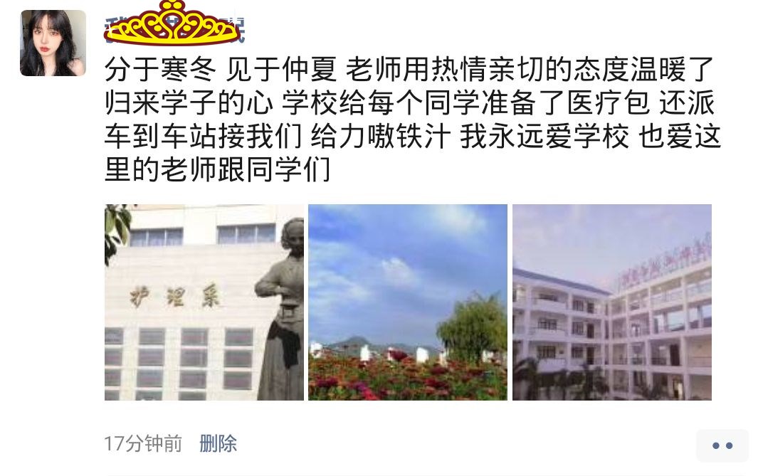 “很溫暖很親切”,18助產(chǎn)301班宋銘鴻說(shuō),“學(xué)校從冬日的寂靜變成了現(xiàn)在百花齊放的景象,隨處可見(jiàn)的關(guān)于歡迎我們復(fù)學(xué)與防控的標(biāo)語(yǔ),明湖前面的向日葵很好看,還多了一個(gè)驛站使我們寄收快遞都更方便了??傊畬W(xué)校在變的越來(lái)越好!這樣的校園讓我感覺(jué)到很溫暖很親切。