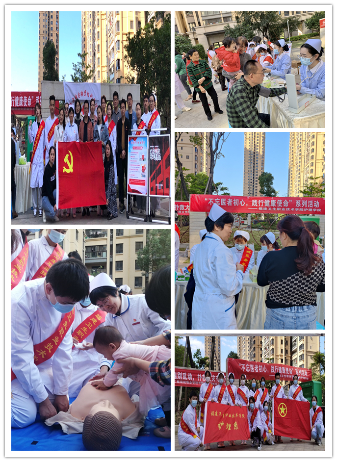 為積極響應學院2020年職業(yè)教育活動周的號召與要求, 11月12日上午,福建衛(wèi)生職業(yè)技術學院護理學院在中鐵城開展了“不忘醫(yī)者初心,踐行健康使命”義診活動。護理學院黨總支書記謝濤、副書記林桂松、紅十字會成員及入黨積極分子參加此次義診。