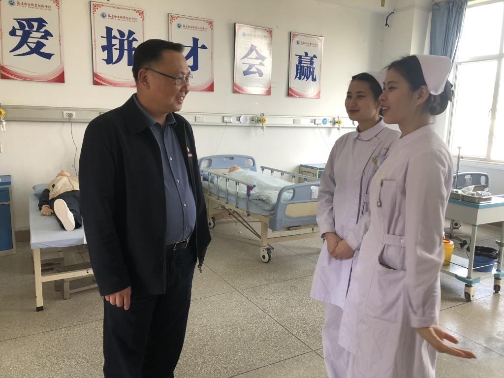 2021年3月24日,校黨委書記曾武祈蒞臨護理學(xué)院實訓(xùn)中心看望備戰(zhàn)2021年福建省護理技能競賽的學(xué)生選手和指導(dǎo)教師。