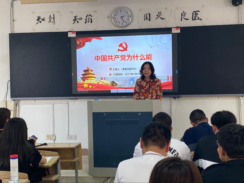在中國共產(chǎn)黨迎來百年華誕之際,為落實(shí)好習(xí)近平總書記在黨史學(xué)習(xí)教育動員大會上的重要講話精神,在全校廣泛開展黨史宣傳教育,普及黨史知識,推動黨史學(xué)習(xí)教育深入群眾、深入基層、深入人心,引導(dǎo)青年學(xué)生強(qiáng)化使命擔(dān)當(dāng)、堅(jiān)定理想信念、厚植家國情懷,3月29日,校黨委副書記李美華走進(jìn)聯(lián)系班級,圍繞“中國共產(chǎn)黨為什么能”為同學(xué)們上開學(xué)思政第一課。