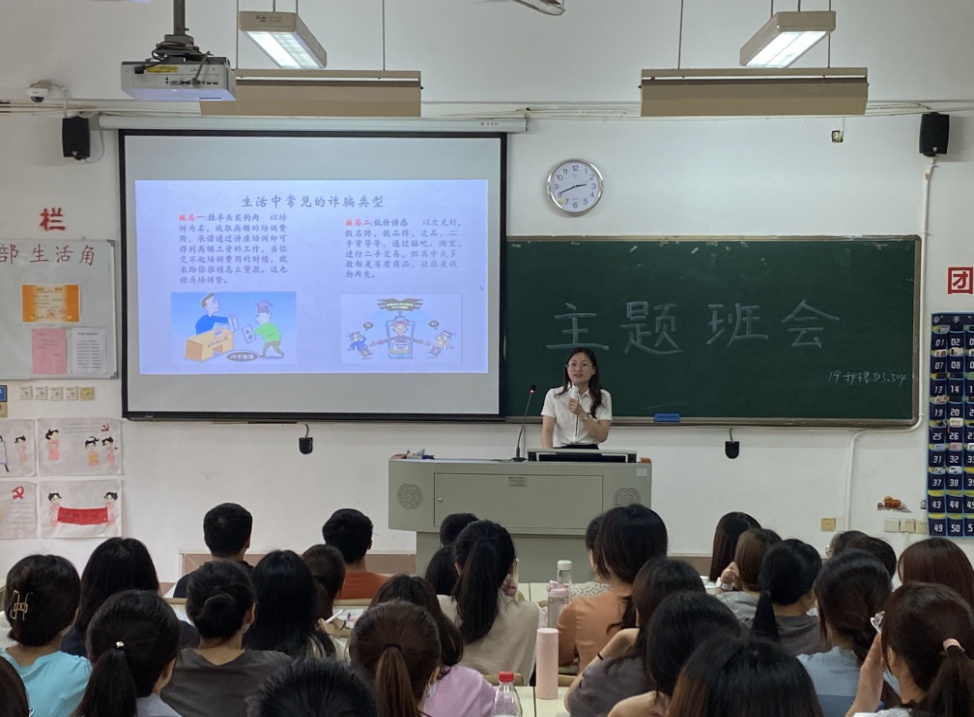 會上,輔導(dǎo)員李英從詐騙的實質(zhì)、常見的詐騙類型、容易被騙的不良心理及應(yīng)對方式幾個方面進行了講解。