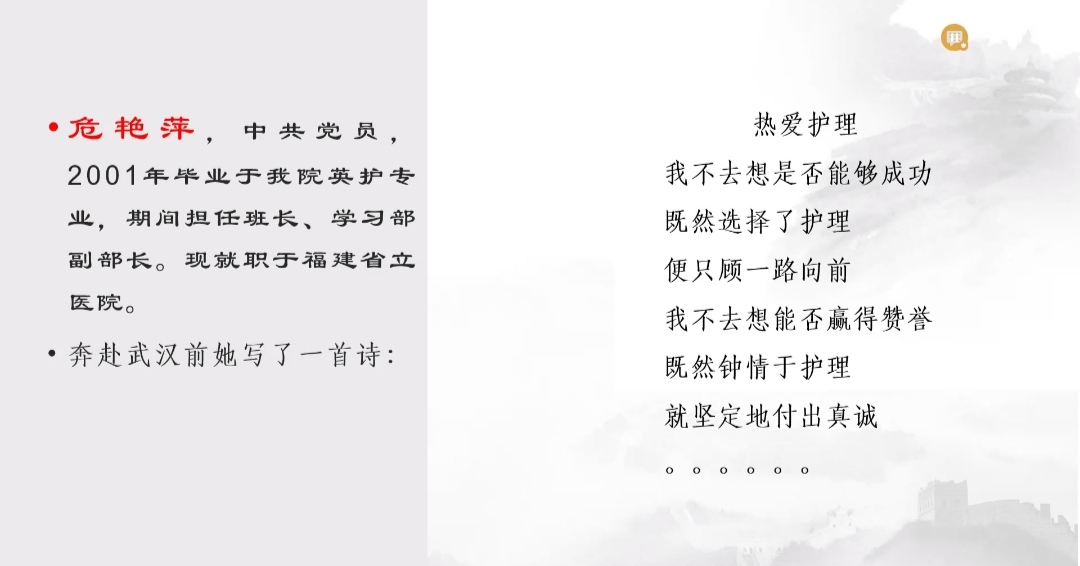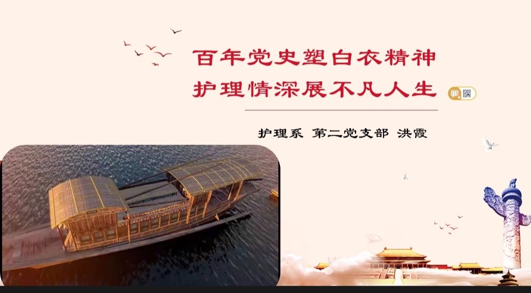 百年征程波瀾壯闊,百年初心歷久彌新,為深入學習黨史,加強師生黨員和入黨積極分子的思想教育,學習抗疫英雄的榜樣精神,2021年4月28日晚,護理學院第二黨支部書記洪霞講授《百年黨史塑白衣精神 護理情深展不凡人生》專題黨課。
