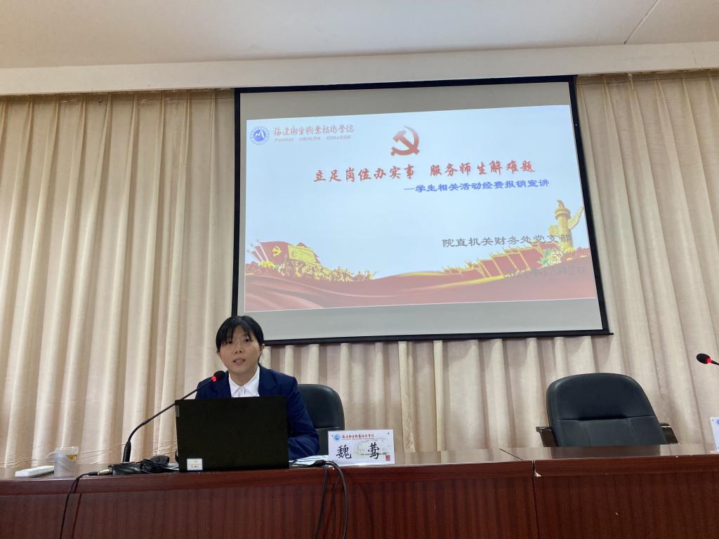 簽約儀式后,一行人在行政樓六樓會議室開展“立足崗位辦實事 服務師生解難題”金融安全知識及財務報銷宣講。中國建設銀行福州鼓樓支行黨營業(yè)部副主任方晶晶結合支部專業(yè)特色,為我校師生宣講金融安全知識,對詐騙的種類、形式及提高防騙意識進行了深入淺出、通俗易懂的講解,具有較強的指導性和實用性。魏鶯結合我校財務報銷實際與師生需求進行了財務報銷培訓。