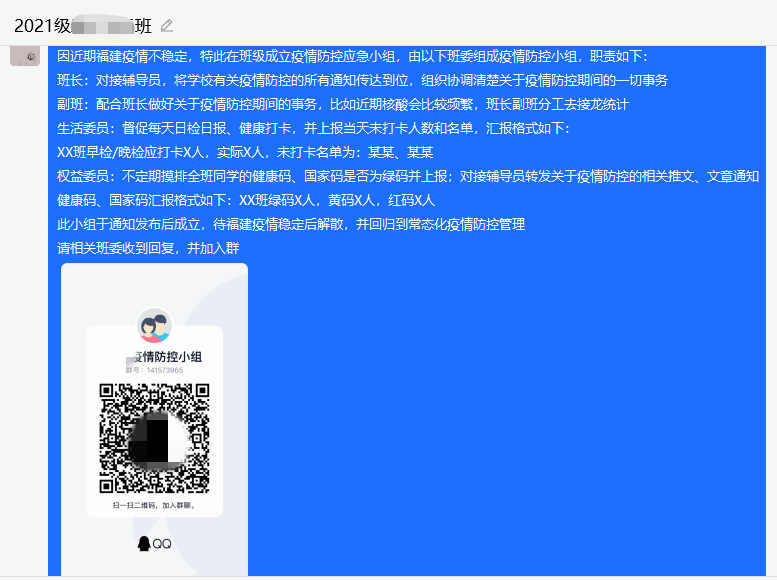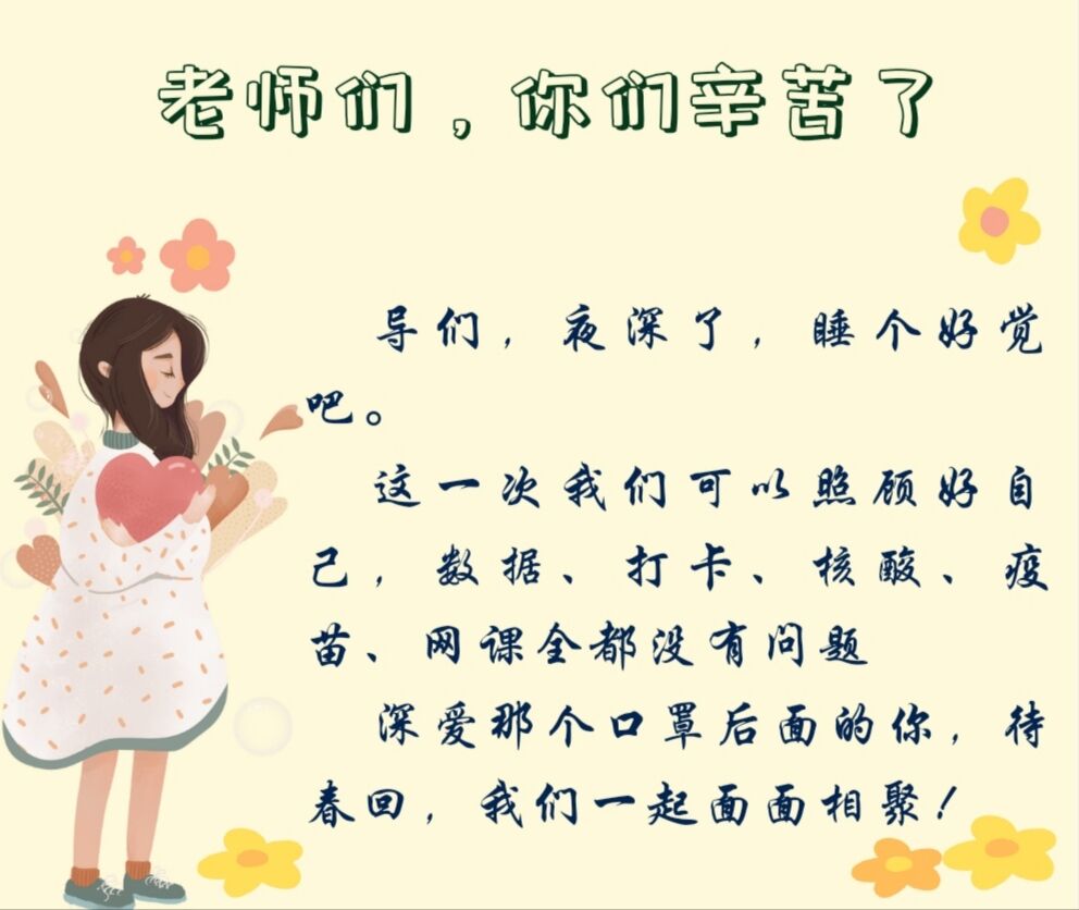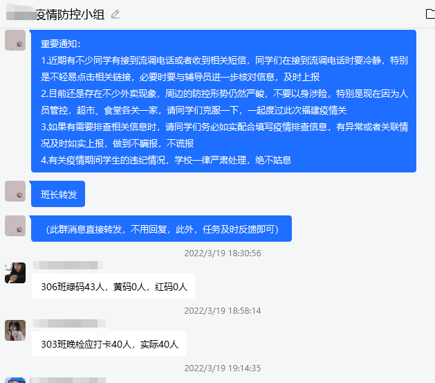 清晨醒來,輔導(dǎo)員們的第一件事不是起床洗漱,而是馬上翻看手機(jī)是否有學(xué)生發(fā)來信息。每個(gè)夜晚,學(xué)生們已經(jīng)入睡,但是每個(gè)班級群里滿是輔導(dǎo)員發(fā)出的關(guān)于疫情防控的最新通知,即使凌晨回到宿舍,他們也處于隨叫隨到的狀態(tài)。