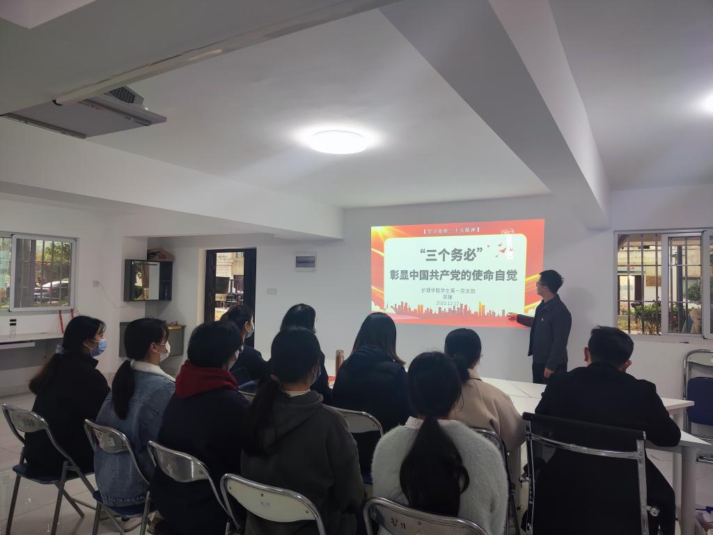 為深入學(xué)習(xí)宣傳貫徹黨的二十大精神,切實(shí)把黨員同志思想和行動(dòng)統(tǒng)一到貫徹落實(shí)黨的二十大精神上來(lái),12月12日,護(hù)理學(xué)院學(xué)生第一黨支部書記吳鋒給支部全體黨員同志上《“三個(gè)務(wù)必”彰顯中國(guó)共產(chǎn)黨的使命自覺》專題黨課。