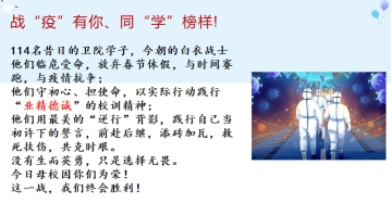 洪霞老師通過挖掘抗擊疫情過程中的鮮活素材,引導(dǎo)學(xué)生以戰(zhàn)“疫”中的同學(xué)為榜樣,學(xué)習(xí)最美逆行者的崇高精神,與時(shí)代同頻共振,肩負(fù)起當(dāng)代青年大學(xué)生的使命和擔(dān)當(dāng)。她還詳細(xì)講解了我們國(guó)家為防止疫情蔓延推出的一系列重要決定和有效措施,以及中華民族在面對(duì)重大磨難時(shí),形成的萬(wàn)眾一心、同舟共濟(jì)的強(qiáng)大合力,引導(dǎo)學(xué)生能夠更好地發(fā)揚(yáng)愛國(guó)主義精神,增強(qiáng)民族自信心和自豪感,樹立責(zé)任意識(shí)和大局意識(shí)。