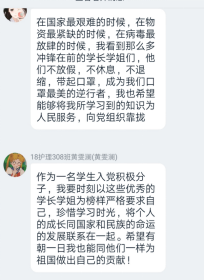 “珍惜當(dāng)下,感恩前行”。在黨課最后,洪霞老師特別提到了“90后”、“00后”在抗擊疫情中的突出表現(xiàn),并號(hào)召同學(xué)們應(yīng)心系天下,爭(zhēng)當(dāng)有理想、有本領(lǐng)、有擔(dān)當(dāng)?shù)臅r(shí)代新人。同學(xué)們表示深受鼓舞,感悟頗豐,在黨課后積極發(fā)言、熱烈討論,紛紛表示定會(huì)在日后的學(xué)習(xí)和工作中向?qū)W長(zhǎng)們學(xué)習(xí),不忘初心、發(fā)奮圖強(qiáng)、不負(fù)使命、不負(fù)青春。