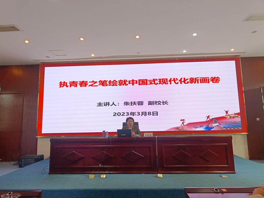 朱扶蓉教授圍繞“賡續(xù)初心、學(xué)深悟透、奮楫篤行”三個方面向大家闡釋接續(xù)奮斗實現(xiàn)中國式現(xiàn)代化的深遠意義,科學(xué)把握中國式現(xiàn)代化的重要特征,激勵廣大學(xué)子以青春之力為中國式現(xiàn)代化著筆增色。