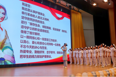 授帽儀式結(jié)束后,護(hù)理學(xué)院內(nèi)科護(hù)理教研室老師林雅珠帶領(lǐng)學(xué)生在這神圣時(shí)刻許下誓言,同學(xué)們舉起右手,鏗鏘誓言指引學(xué)生用崇高的信仰建起生命的方舟,用錚錚誓言表達(dá)不辱白衣天使神圣使命的決心。
