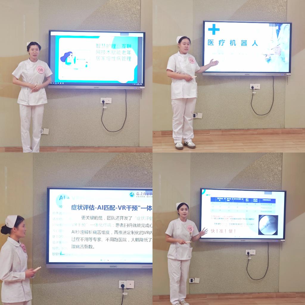 主題匯報(bào)環(huán)節(jié)中,選手們圍繞“VR技術(shù)在護(hù)理實(shí)訓(xùn)中的應(yīng)用”、“AI賦能老年照護(hù)”等自選主題展開(kāi)闡述,結(jié)合傳統(tǒng)護(hù)理理念與技術(shù)發(fā)展趨勢(shì),展現(xiàn)出良好的學(xué)科交叉意識(shí)與創(chuàng)新思維。匯報(bào)內(nèi)容結(jié)構(gòu)清晰、數(shù)據(jù)詳實(shí),表達(dá)流暢自信,充分體現(xiàn)了我院護(hù)生扎實(shí)的專業(yè)基礎(chǔ)與開(kāi)闊的職業(yè)視野。
