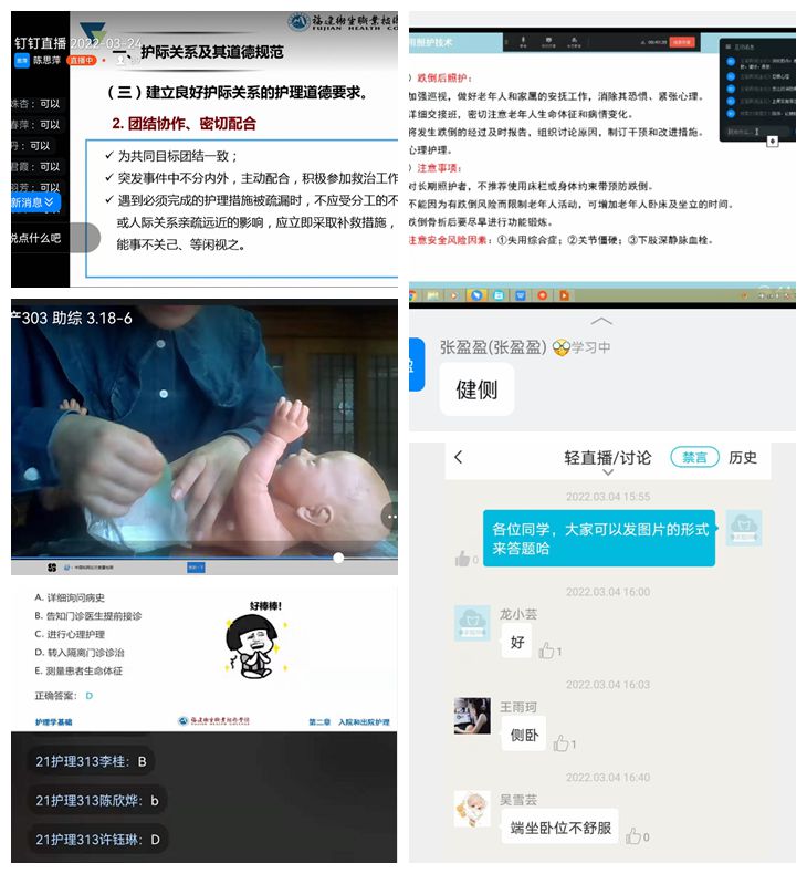 教學(xué)相長(zhǎng),老師們的傾囊相授,換來(lái)的是同學(xué)們的積極配合。雖然是在宿舍上課,同學(xué)們依然穿戴整齊,端坐桌前,保持著課堂的儀式感。護(hù)理專(zhuān)業(yè)課技能操作多,宿舍的條件雖然比不上實(shí)訓(xùn)室,但辦法總比困難多,同學(xué)們開(kāi)動(dòng)腦筋,就地取材,娃娃、枕頭變身模擬人,搬運(yùn)患者、心肺復(fù)蘇、嬰兒撫觸……只要有心,沒(méi)有什么能阻擋他們學(xué)習(xí)的熱情。