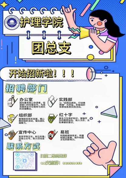 護(hù)理學(xué)院團(tuán)總支期待與你們攜手并進(jìn),共創(chuàng)輝煌。若你心懷熱忱,渴望成長(zhǎng),就請(qǐng)掃描下方二維碼,加入我們這個(gè)充滿活力的大家庭吧!讓我們一起,在青春的舞臺(tái)上綻放光芒,書寫屬于我們的精彩篇章!