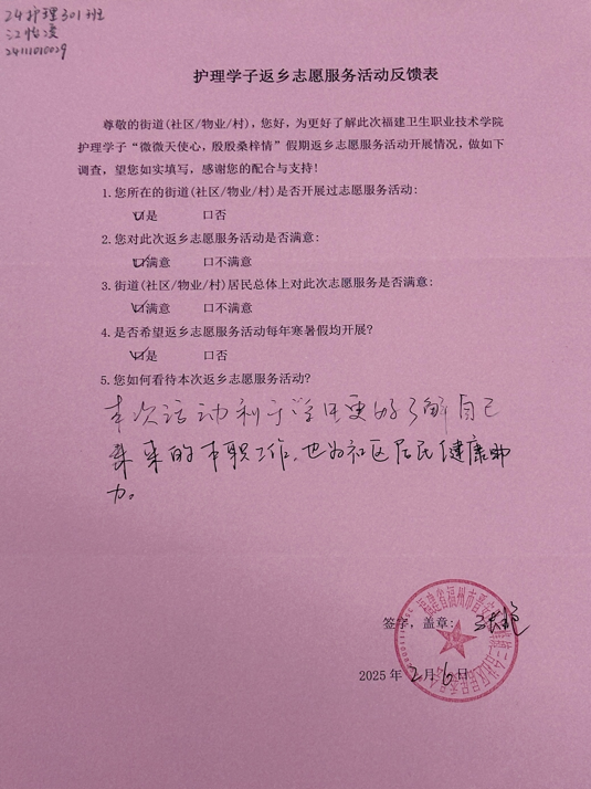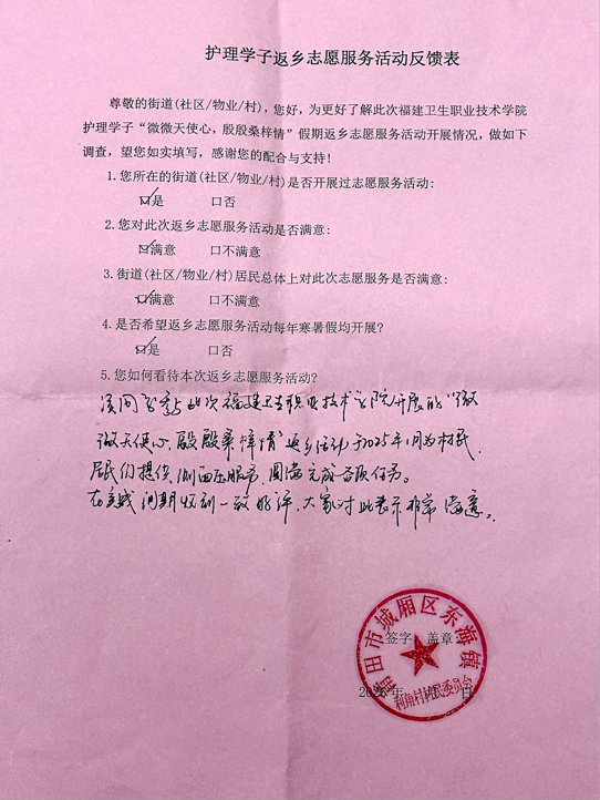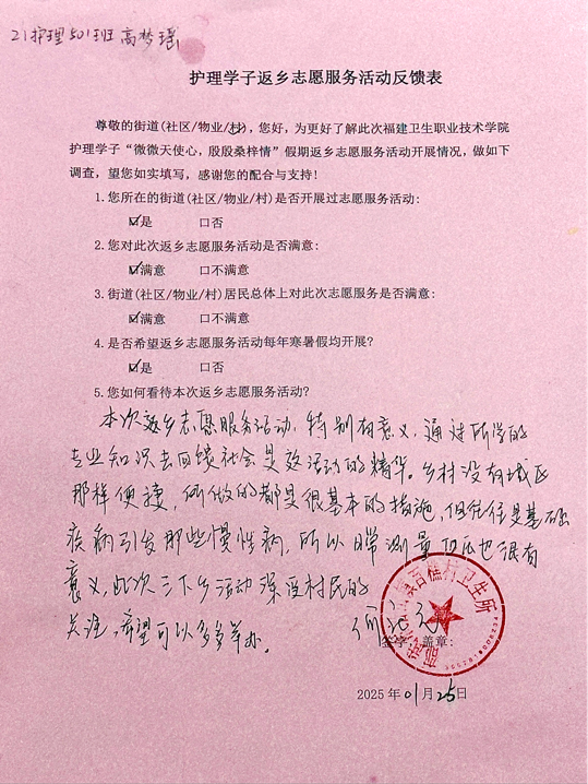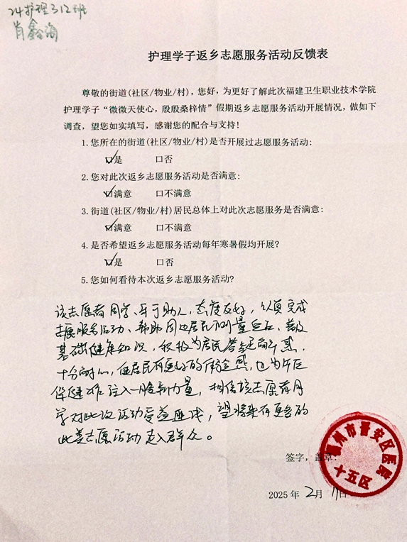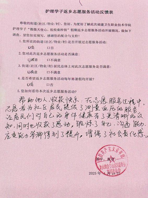 在這個(gè)寒冬里,護(hù)理學(xué)院學(xué)子帶著“微微天使心,殷殷桑梓情”來到大家身邊。一場(chǎng)義診活動(dòng),溫暖了整個(gè)社區(qū)。大家紛紛表達(dá)著感激。讓我們來翻閱鄉(xiāng)親們的反饋表,上面真誠的文字,就像一面鏡子,映照出志愿者們的熱忱與付出,也見證著鄰里間因?yàn)檫@場(chǎng)活動(dòng)愈發(fā)緊密的情誼。每一張表,都是一份認(rèn)可,承載著鄉(xiāng)親對(duì)學(xué)子們深深的謝意。