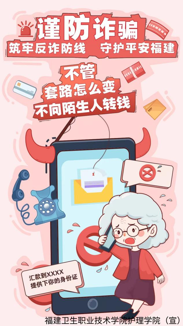 海報(bào)以“謹(jǐn)防詐騙”為核心主題,通過“筑牢反詐防線,守護(hù)平安福建”的口號(hào),強(qiáng)調(diào)了防范詐騙對(duì)于維護(hù)社會(huì)平安的重要性?!?/span>不管套路怎么變,不向陌生人轉(zhuǎn)錢”這一口號(hào)簡(jiǎn)潔明了,直接點(diǎn)出了詐騙的常見手段——誘騙受害者轉(zhuǎn)賬。同時(shí),通過老年女性角色的驚恐表情和手機(jī)屏幕上的禁止符號(hào),增強(qiáng)了警示效果,使得公眾能夠更容易地理解和記住防范要點(diǎn)。