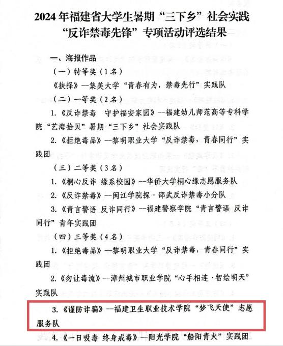 在2024年福建省大學(xué)生暑假“三下鄉(xiāng)”社會(huì)實(shí)踐“反詐禁毒先鋒”專項(xiàng)活動(dòng)中,我院“夢(mèng)飛天使”志愿服務(wù)隊(duì)?wèi){借卓越的海報(bào)作品,榮獲三等獎(jiǎng)的佳績(jī)!