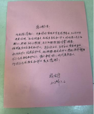 近日,護(hù)理學(xué)院22護(hù)理315班黃鈺淇同學(xué),在福建醫(yī)科大學(xué)附屬第一醫(yī)院43區(qū)綜合病區(qū)實(shí)習(xí)期間,收到了住院患者親筆書(shū)寫(xiě)的感謝信。護(hù)理部及科室護(hù)士長(zhǎng)也對(duì)該同學(xué)給予高度贊揚(yáng)。