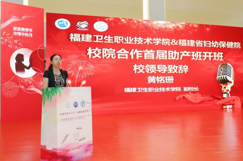黃銘珊在講話中感謝福建省婦幼保健院給予我校大力支持與幫助,并指出校院合作、產(chǎn)教融合是職業(yè)教育辦學的重要類型特征,是職業(yè)教育高質(zhì)量發(fā)展的生命線,更是”雙高校“建設(shè)發(fā)展的重要模式,同時對校院合作班的學生們寄予厚望,希望同學們珍惜學習機會,虛心求教,積極進取,注重實踐,知行合一。