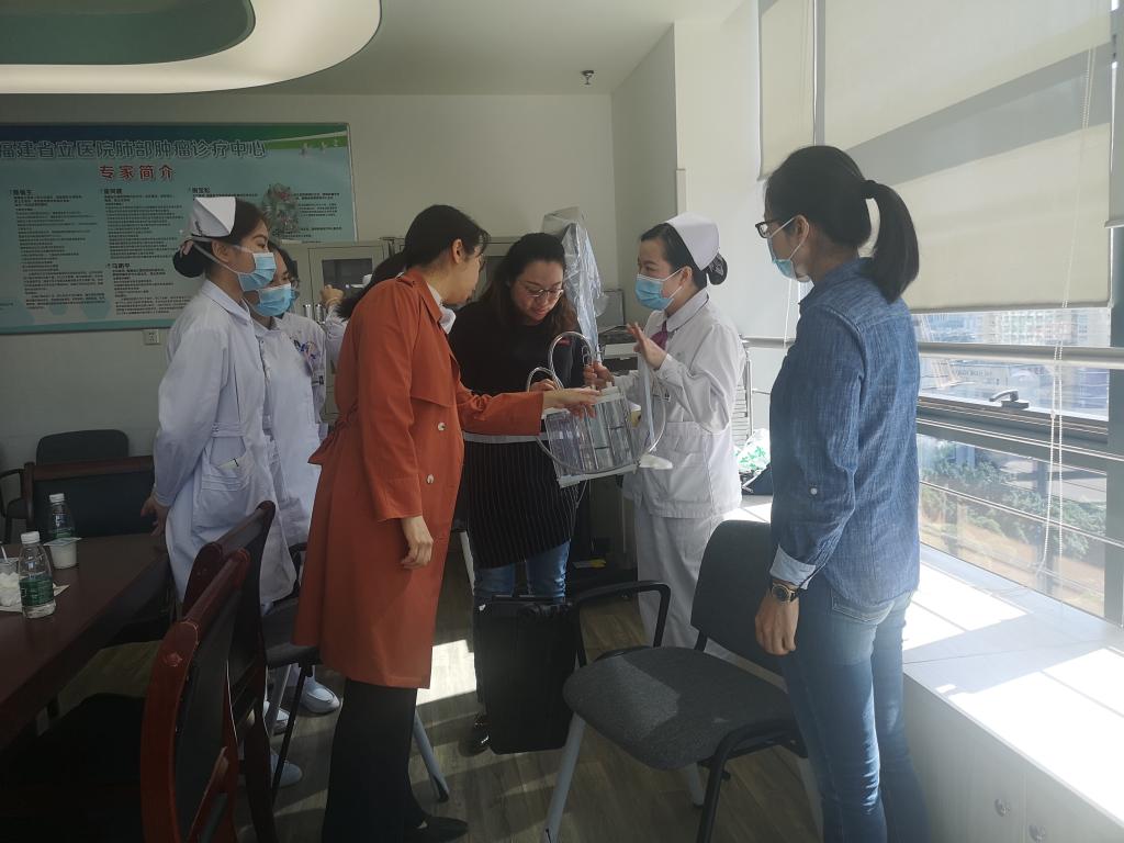 涂秀華老師還熱情地為教研室的老師們分享了她制作的教學(xué)視頻——《氣胸病人的胸腔置管術(shù)》、《胸腔閉式引流管的拔管方法》、《肺癌病人的術(shù)前術(shù)后健康宣教》,交流了肺癌患者的微創(chuàng)胸腔鏡手術(shù)治療與護(hù)理,還向老師們展示了該科室獲國(guó)家專利的多功能輸液架,使老師們更新了知識(shí),拓寬了視野。
