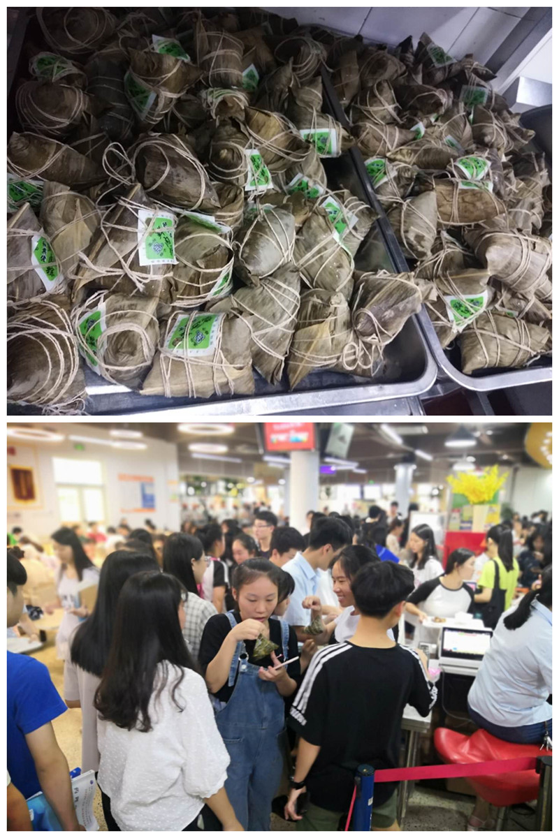 午餐時(shí)間,明湖餐廳員工向前來用餐的師生分發(fā)熱氣騰騰的肉粽。領(lǐng)取現(xiàn)場人頭攢動(dòng)而又秩序井然,師生們滿面笑容,現(xiàn)場洋溢著濃厚的節(jié)日氛圍。