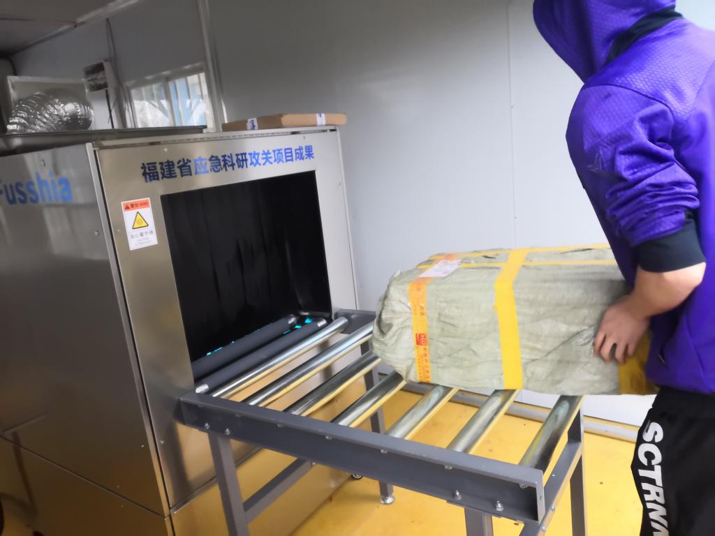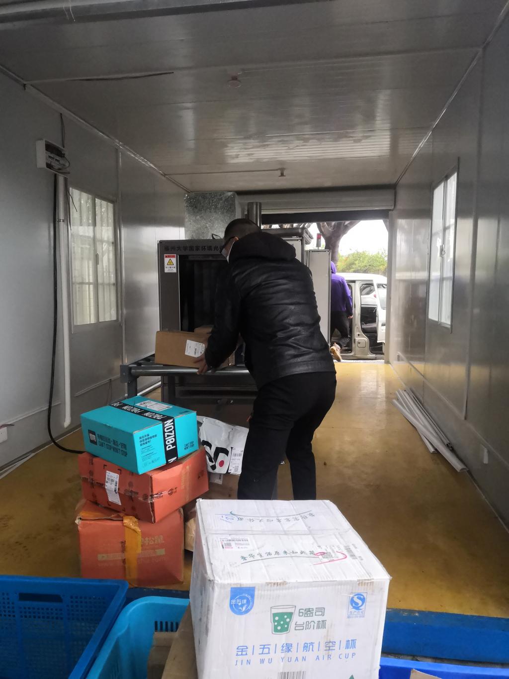該消殺工作站配備的紫外光催化復(fù)合消殺設(shè)備采用消殺能力最強的254nm波長紫外線光源,具有快速高效無污染的消殺特點,每小時可消毒2000件貨物。所有進校的快遞在校門外中轉(zhuǎn)站進行消毒液噴霧消毒后,再轉(zhuǎn)運至紫外光催化復(fù)合消殺工作站進行二次消毒。冷鏈?zhǔn)称吠ㄟ^紫外光催化復(fù)合消殺后再入庫儲藏。該工作站的啟用,為校園防疫消殺增添了新利器。