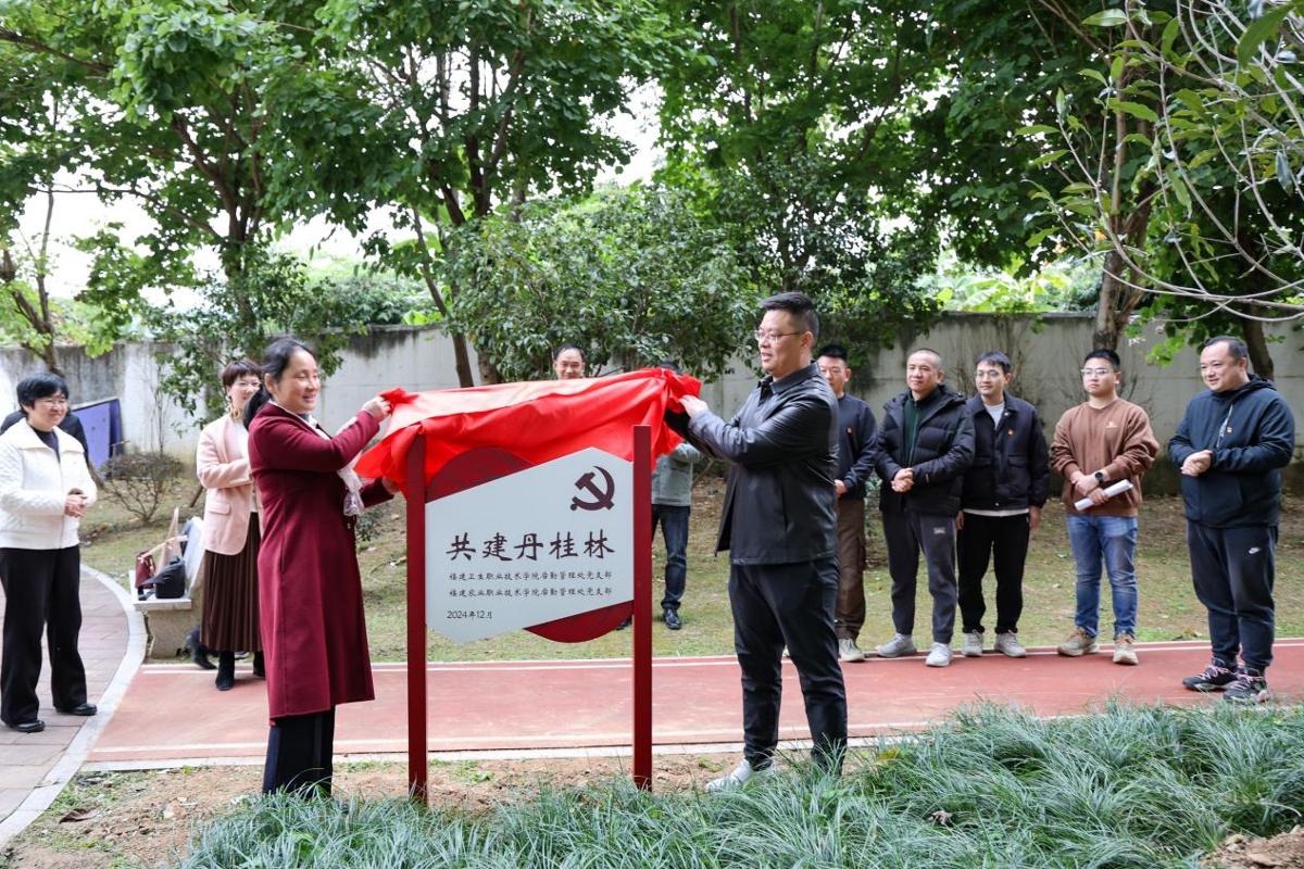 為加強高校基層黨支部建設,發(fā)揮黨支部黨建聯(lián)建的優(yōu)勢互補作用,12月25日下午,我校后勤管理處黨支部與福建農業(yè)職業(yè)技術學院后勤管理處黨支部在環(huán)校步道舉行支部共建“丹桂林”揭牌儀式,我校組織部部長謝濤、院直機關黨總支書記艾松軍、福建農業(yè)職業(yè)技術學院后勤管理處黨支部書記黃曉梅以及兩校后勤管理處黨支部黨員同志參加揭牌儀式。