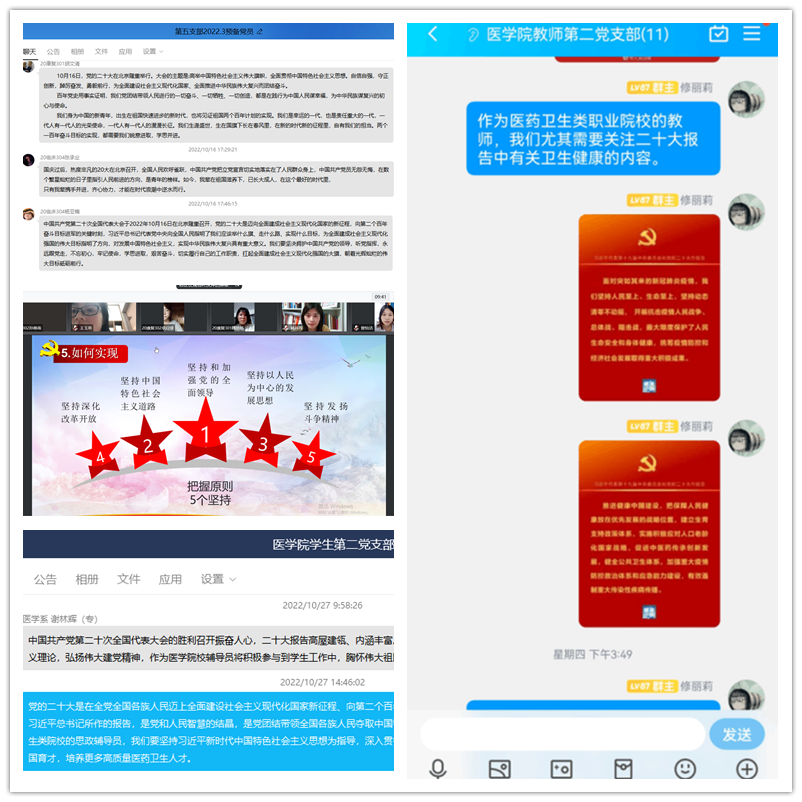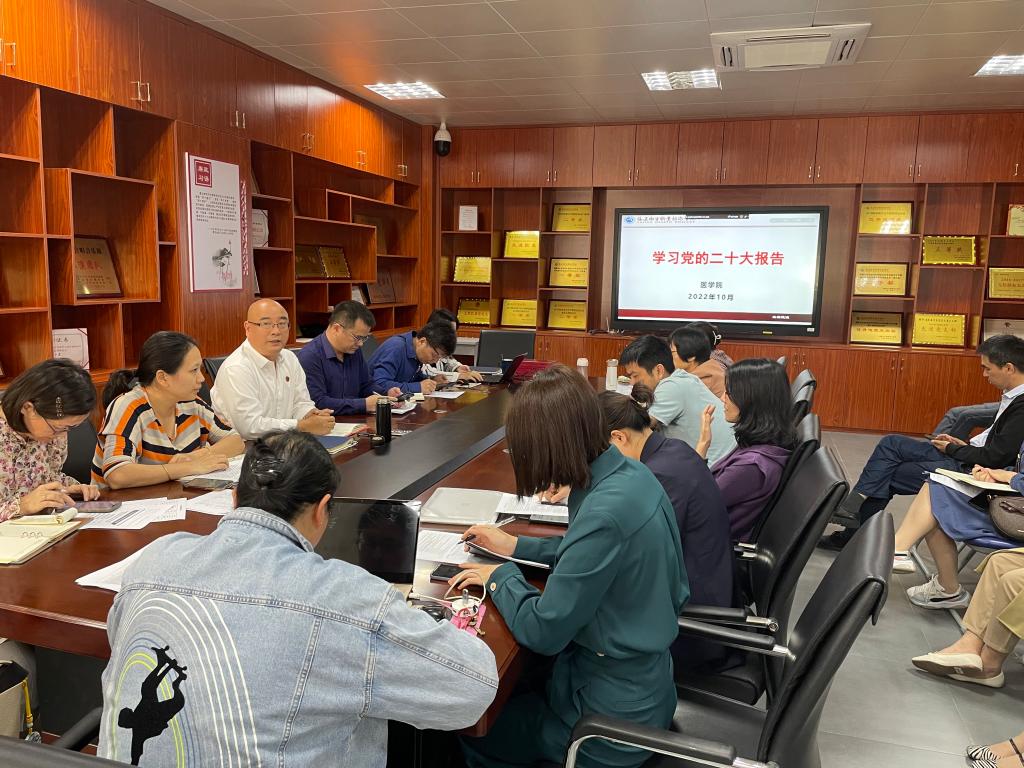 醫(yī)學(xué)院黨總支通過全院教職工大會、黨總支理論學(xué)習(xí)中心組(擴大)會議、主題黨日、主題班會、團日活動等形式,全面系統(tǒng)地將黨的二十大報告的思想精髓及核心要義,傳達到每一位師生員工。同時,還圍繞學(xué)習(xí)貫徹黨的二十大精神,展開主題研討和心得交流活動,以思想碰撞夯實理想信念之基,推進學(xué)習(xí)走心、走實、走深。