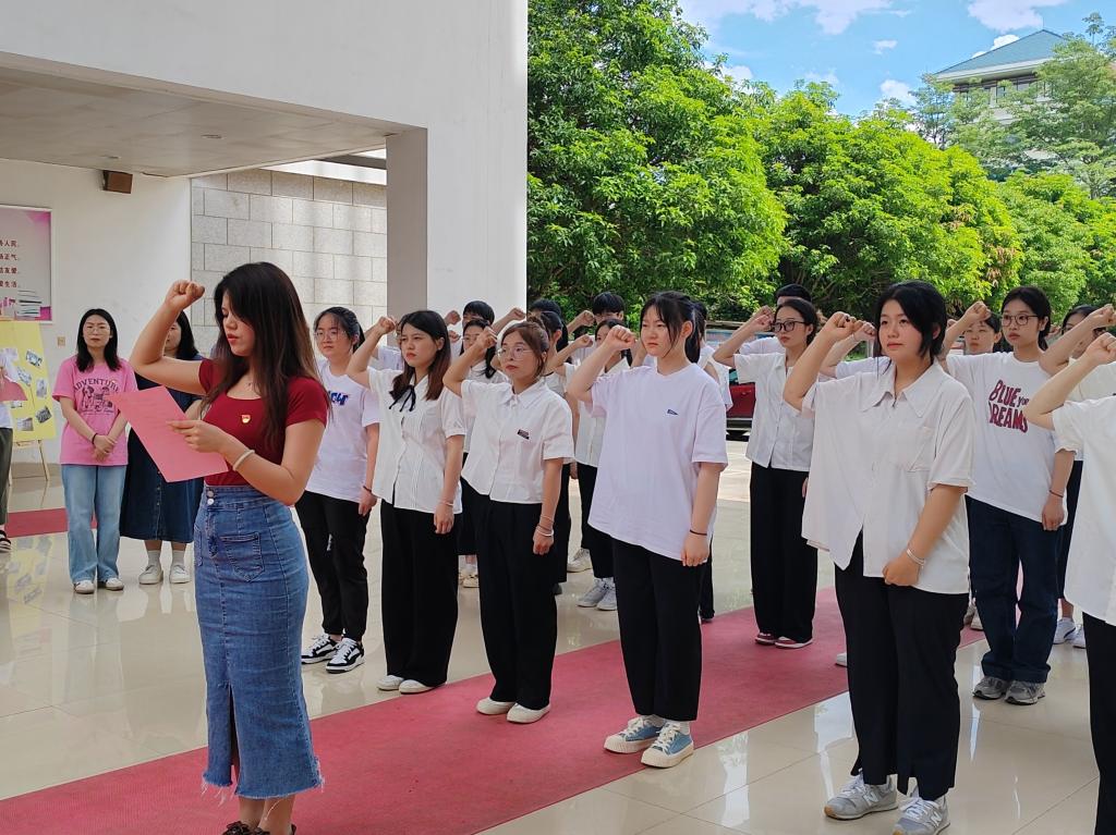 宣誓儀式在教學(xué)樓前進(jìn)行,雄壯肅穆的國際歌拉開儀式帷幕。林燕同志宣讀參加入黨宣誓儀式的預(yù)備黨員名單。在厲逢妹同志的帶領(lǐng)下,預(yù)備黨員面向黨旗莊嚴(yán)宣誓。激昂的誓言字字千鈞,擲地有聲,久久回蕩,留下閩衛(wèi)院黨員學(xué)子的忠誠承諾。