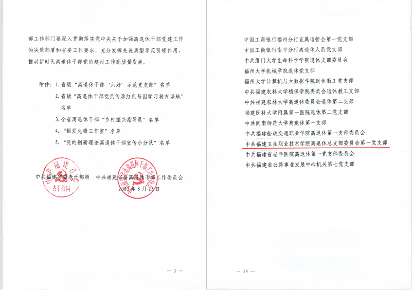 日前,中共福建省委老干部局、中共福建省委離退休干部工作委員會(huì)公布了2023年省級(jí)“離退休干部‘六好’示范黨支部”等“五個(gè)一百”名單,我校離退休黨總支第一黨支部首次被確定為省級(jí)“離退休干部‘六好’示范黨支部”,推動(dòng)學(xué)校離退休干部黨建工作邁上新臺(tái)階。