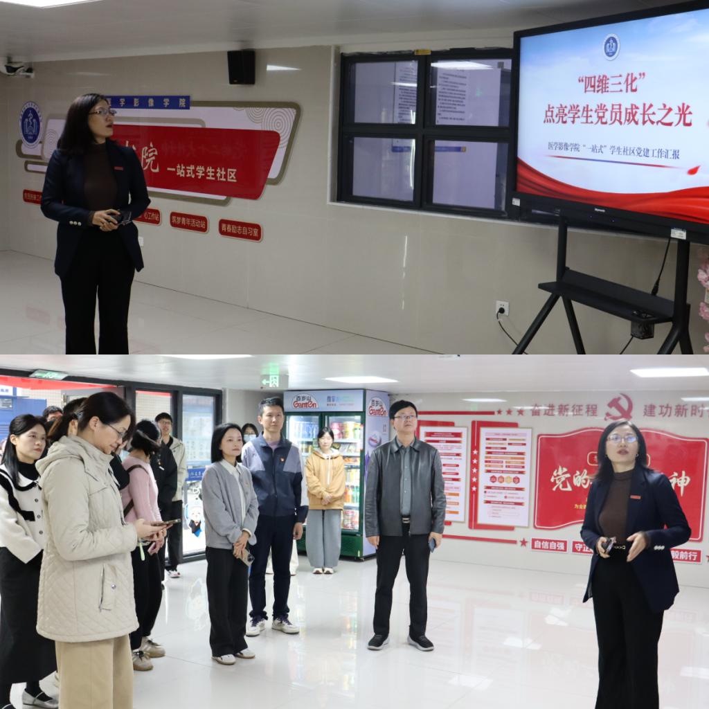 在福建醫(yī)科大學(xué)醫(yī)學(xué)影像學(xué)院黨委副書記黃東燦、團(tuán)委書記吳文捷的陪同下,我校師生先后實(shí)地走訪了醫(yī)學(xué)影像學(xué)院“青耕”學(xué)生工作站、藥學(xué)院學(xué)生工作站、基礎(chǔ)醫(yī)學(xué)院“橘井·初心書院”及醫(yī)學(xué)影像學(xué)院“致遠(yuǎn)書院”等多個(gè)“一站式”學(xué)生社區(qū)示范點(diǎn)。每到一處,我校師生都認(rèn)真聆聽介紹,細(xì)致觀摩環(huán)境,詳細(xì)了解社區(qū)空間規(guī)劃、功能布局、隊(duì)伍進(jìn)駐及活動(dòng)開展等情況。福建醫(yī)科大學(xué)將育人元素深度融入生活場景的建設(shè)理念,尤其通過綜合服務(wù)站、黨建主題園區(qū)、多功能共享空間等載體,實(shí)現(xiàn)思想引導(dǎo)、學(xué)業(yè)支持、生活服務(wù)一體化,給予我校師生深刻啟發(fā)。