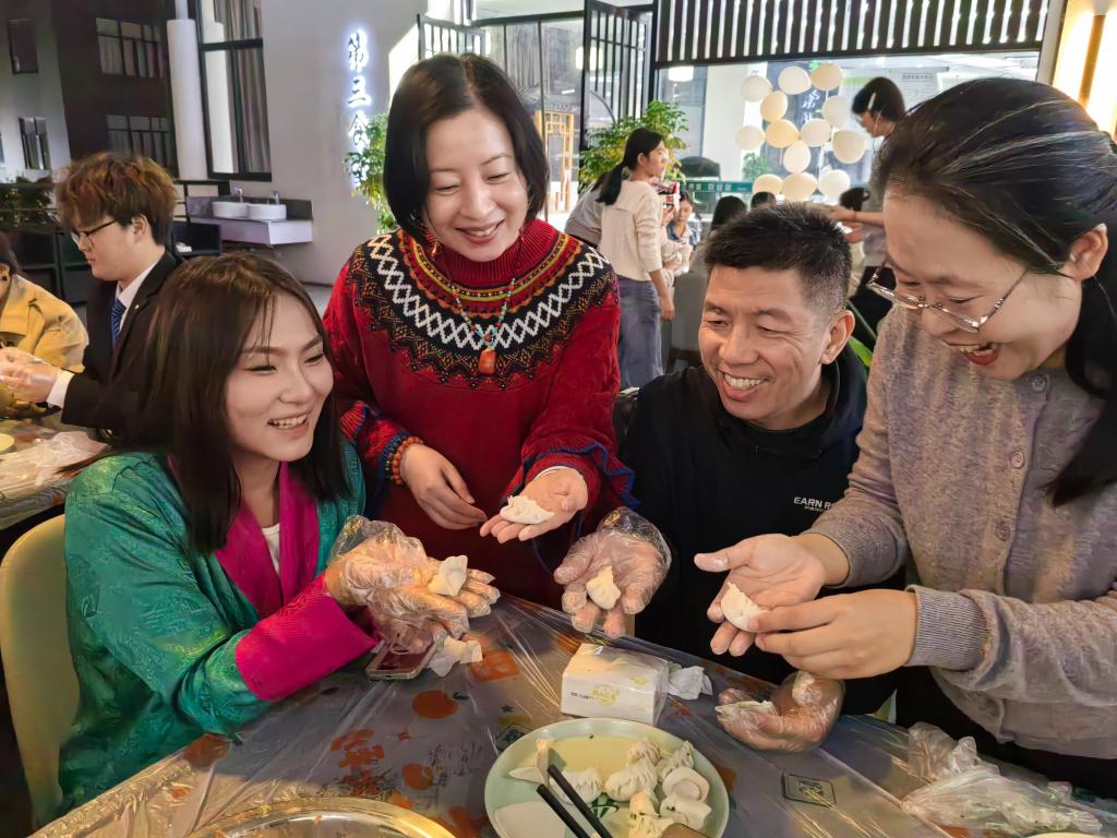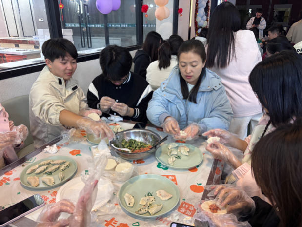 包餃子環(huán)節(jié)堪稱(chēng)“暖心重頭戲”。40名少數(shù)民族學(xué)生分成8個(gè)小組,新鮮食材整齊陳列。有經(jīng)驗(yàn)的同學(xué)化身“小導(dǎo)師”,手把手傳授包餡、捏褶技巧;教師主動(dòng)融入,創(chuàng)意包出花朵、小動(dòng)物等特色餃子,現(xiàn)場(chǎng)歡聲笑語(yǔ)不斷,盡顯“民族大家庭”的溫暖。