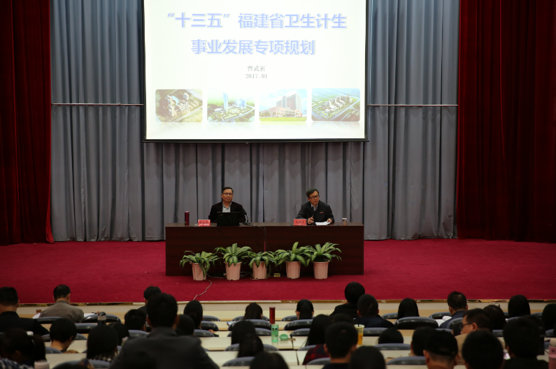 1月3日,學(xué)院黨委書(shū)記曾武祈同志在學(xué)院學(xué)術(shù)廳舉辦福建省“十三五”衛(wèi)生計(jì)生事業(yè)發(fā)展規(guī)劃專(zhuān)題講座,曾書(shū)記作為福建省“十三五”衛(wèi)生計(jì)生事業(yè)發(fā)展規(guī)劃起草組成員,對(duì)福建省“十三五”衛(wèi)生計(jì)生事業(yè)發(fā)展規(guī)劃進(jìn)行解讀。學(xué)院領(lǐng)導(dǎo)、全院教職工及部分學(xué)生代表參加,講座由廖偉堅(jiān)副院長(zhǎng)主持。