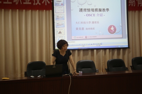 4月29日下午臺灣大仁科技大學(xué)護理系主任黃美惠助理教授應(yīng)邀蒞臨我院開展題為《護理情境模擬教學(xué)—OSCE介紹》的專題講座,院長郭素華、副院長廖偉堅以及教職員工、學(xué)生代表100多人聆聽了本次講座,講座由護理系書記謝濤副教授主持。