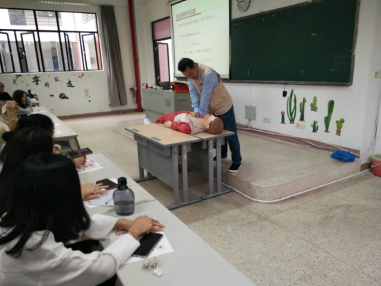 鄭明華老師向同學(xué)們介紹了福建省紅十字會(huì)應(yīng)急救護(hù)工作的概況及掌握應(yīng)急救護(hù)技能的重要性和必要性。他用特有的生動(dòng)和詼諧風(fēng)格,為同學(xué)詳細(xì)講解了多種應(yīng)急救護(hù)方案,細(xì)致地為同學(xué)們介紹了心肺復(fù)蘇術(shù)的適用場景和操作要點(diǎn),借助安妮假人現(xiàn)場示范,展示如何呼救、如何正確撥打急救電話、召集大家共同參與急救、胸外按壓、開放氣道、人工呼吸等一系列操作,同時(shí)現(xiàn)場演示了AED除顫儀的使用方法,為同學(xué)們帶來了實(shí)用的一課。
