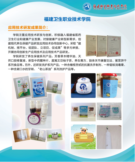 6月17日至21日,第十七屆中國·海峽項(xiàng)目成果交易會(huì)(簡稱“6·18”)在福州海峽國際會(huì)展中心舉行,學(xué)院組織了14項(xiàng)應(yīng)用技術(shù)研發(fā)成果參展,主要有:含漱口水的電動(dòng)牙刷、嬰兒紙尿褲預(yù)警提醒裝置、新型中藥醒神片、“老山茶油”洗護(hù)系列、養(yǎng)生膏方、紫菜餅干、度尾文旦柚子茶、藥膳撲克牌以及肢體關(guān)節(jié)康復(fù)功法視頻和常用藥品分類游戲軟件視頻等。