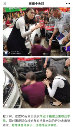 原來是4月20日,莆田黃石舉行盛大的民俗出游活動(dòng),數(shù)以萬計(jì)的市民圍觀?;顒?dòng)中,一名七旬老婦人不知為何倒地不起,圍觀群眾束手無策。就在這危急時(shí)刻,人群中擠過一位女孩,趴在老婦人身邊實(shí)施急救,又附身為老婦人喂水,直到老人醒來。經(jīng)過詢問,原來這位老人家患有高血壓、糖尿病,加上午后氣溫升高,致使老人突發(fā)不適暈倒在地。看著老人轉(zhuǎn)危為安,周圍人群紛紛向這位黑衣女孩投來贊許的目光。女孩卻謙虛地表示,她畢業(yè)于福建衛(wèi)生職業(yè)技術(shù)學(xué)院,這是她應(yīng)該做的。