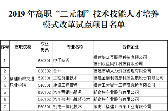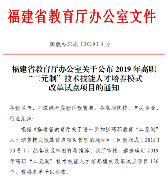 根據(jù)《福建省教育廳關(guān)于進一步加強高職教育“二元制”人才培養(yǎng)模式改革試點項目管理的通知》(閩教職成〔2018〕50號),我院與福建承天金嶺藥業(yè)有限公司合作開辦的中藥學專業(yè)確定為2019年高職“二元制”技術(shù)技能人才培養(yǎng)模式改革試點項目。