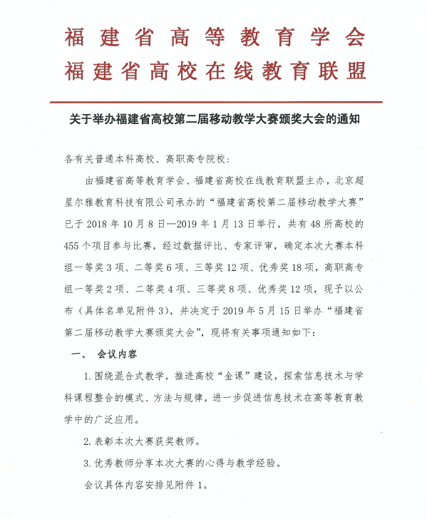 大賽旨在進(jìn)一步推動(dòng)我省高校在線開放課程建設(shè)與應(yīng)用共享,促進(jìn)信息技術(shù)與教育教學(xué)深度融合,推動(dòng)高等學(xué)校教育教學(xué)改革,提高高等教育教學(xué)質(zhì)量,服務(wù)學(xué)習(xí)型社會(huì)建設(shè)。