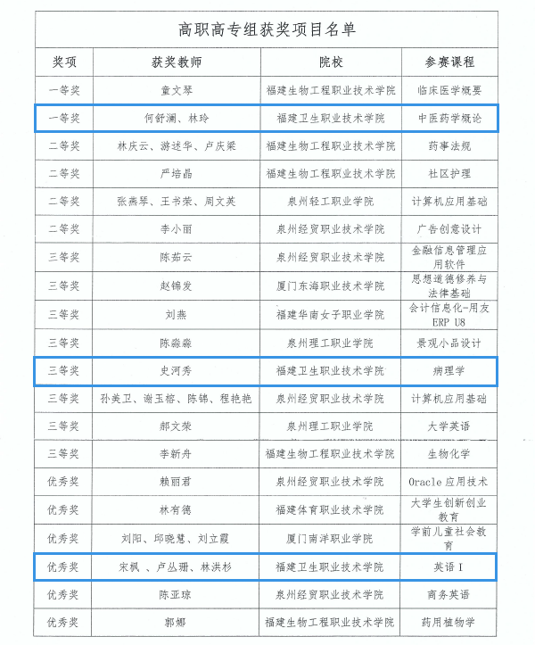 近日,由福建省高等教育學(xué)會(huì)、福建省高校在線教育聯(lián)盟主辦的“福建省高校第二屆移動(dòng)教學(xué)大賽”獲獎(jiǎng)結(jié)果公布,經(jīng)過48所高校455個(gè)項(xiàng)目的角逐,確定本次大賽高職高專組一等獎(jiǎng)2項(xiàng)、二等獎(jiǎng)4項(xiàng)、三等獎(jiǎng)8項(xiàng)、優(yōu)秀獎(jiǎng)12項(xiàng)。我院藥學(xué)系何舒瀾、林玲的參賽課程《中醫(yī)藥學(xué)概論》獲一等獎(jiǎng),基礎(chǔ)部史河秀的參賽課程《病理學(xué)》獲三等獎(jiǎng),基礎(chǔ)部宋楓、盧叢珊、林洪杉的參賽課程《英語Ⅰ》獲優(yōu)秀獎(jiǎng)。