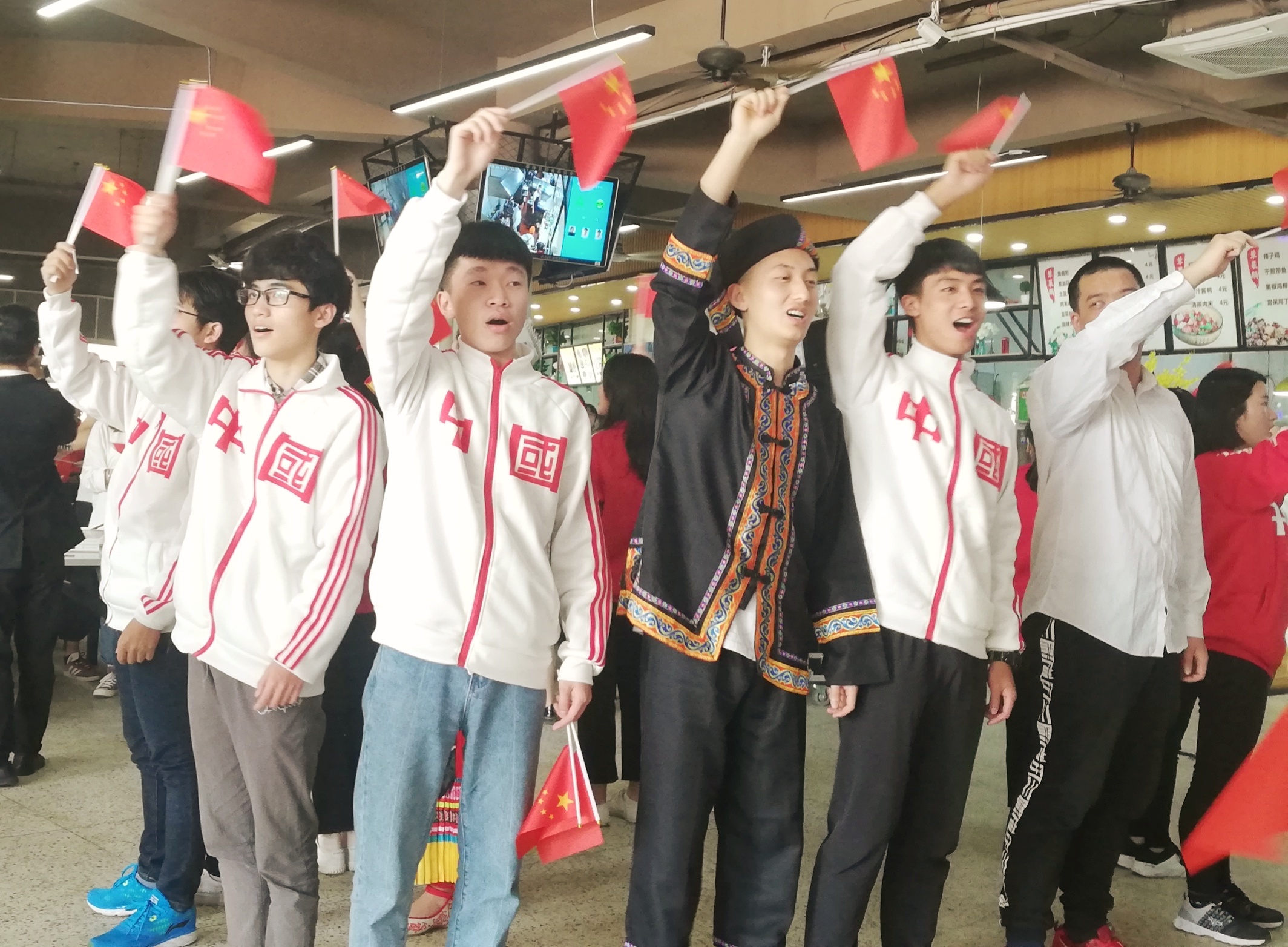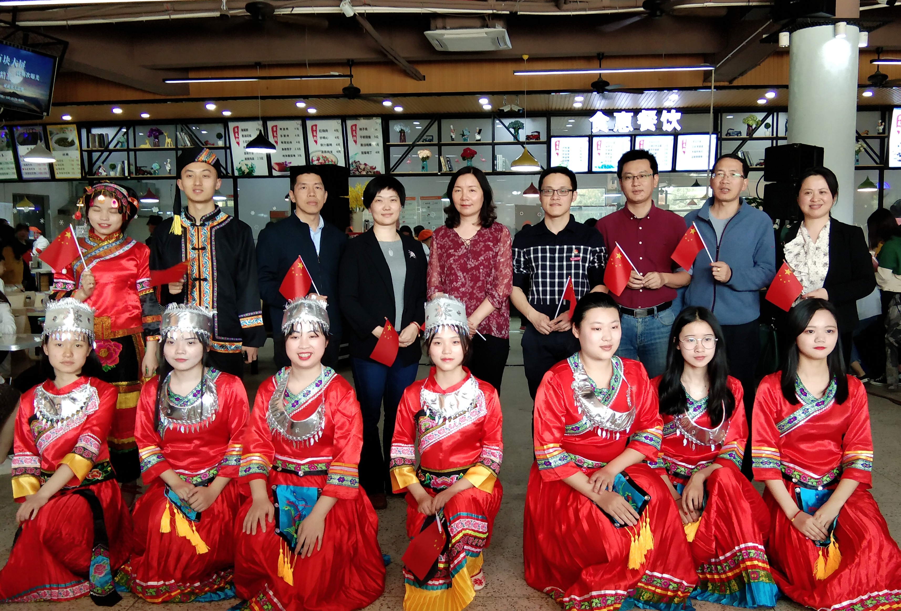在特色的畬族歌曲中,活動正式開始。畬族同學(xué)用歌舞組合的方式呈現(xiàn)了民族歌謠的魅力,并通過敬茶互動儀式讓出席的老師同學(xué)們參與其中。隨后,各民族及漢族同學(xué)共同快閃合唱了《我和我的祖國》,充分展現(xiàn)了各民族之間的和諧與團結(jié)與愛國之情。餐廳就餐的師生也熱情參與到大合唱中。