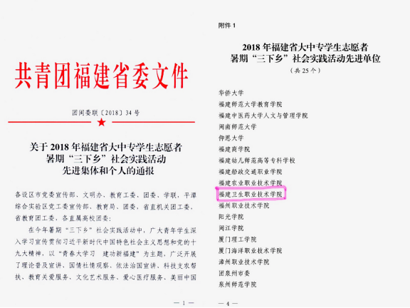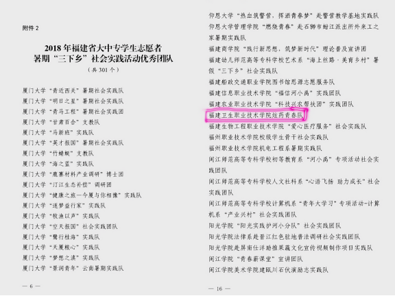 近日,中共福建省委宣傳部、中國(guó)福建省委文明辦、中國(guó)福建省委教育工委、共青團(tuán)福建省委、福建省學(xué)生聯(lián)合會(huì)聯(lián)合下發(fā)《關(guān)于2018年福建省大中專學(xué)生志愿者暑期“三下鄉(xiāng)”社會(huì)實(shí)踐活動(dòng)先進(jìn)集體和先進(jìn)個(gè)人的通報(bào)》(團(tuán)閩委聯(lián)〔2018〕34號(hào)),我院榮獲福建省“三下鄉(xiāng)”社會(huì)實(shí)踐先進(jìn)單位,藥學(xué)系炫藥青春隊(duì)獲福建省“三下鄉(xiāng)”社會(huì)實(shí)踐優(yōu)秀團(tuán)隊(duì),團(tuán)委宋秋瓊老師獲福建省“三下鄉(xiāng)”社會(huì)實(shí)踐先進(jìn)工作者,管理系李沅慧同學(xué)獲福建省“三下鄉(xiāng)”先進(jìn)個(gè)人。
