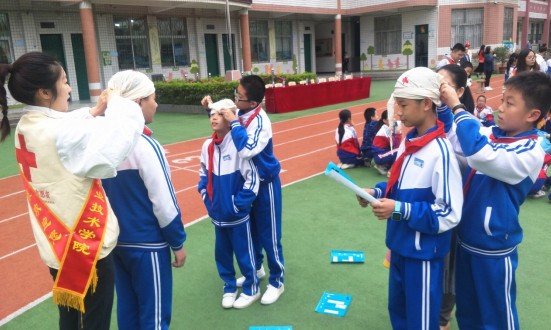 “記住要領(lǐng),三角巾底邊反折兩橫指,正中點置于眉毛上,頂角位于枕后,兩底角經(jīng)耳上拉緊到后腦勺交叉……”福建衛(wèi)生職業(yè)技術(shù)學(xué)院大學(xué)生紅十字科普志愿者一遍遍強調(diào)著動作要領(lǐng),糾正小學(xué)生的動作。小學(xué)生們認(rèn)真練習(xí),不時還向志愿者哥哥姐姐們提問請教。小學(xué)生們認(rèn)真學(xué)習(xí)著三角巾頭部包扎、大小懸臂包扎等包扎技能。